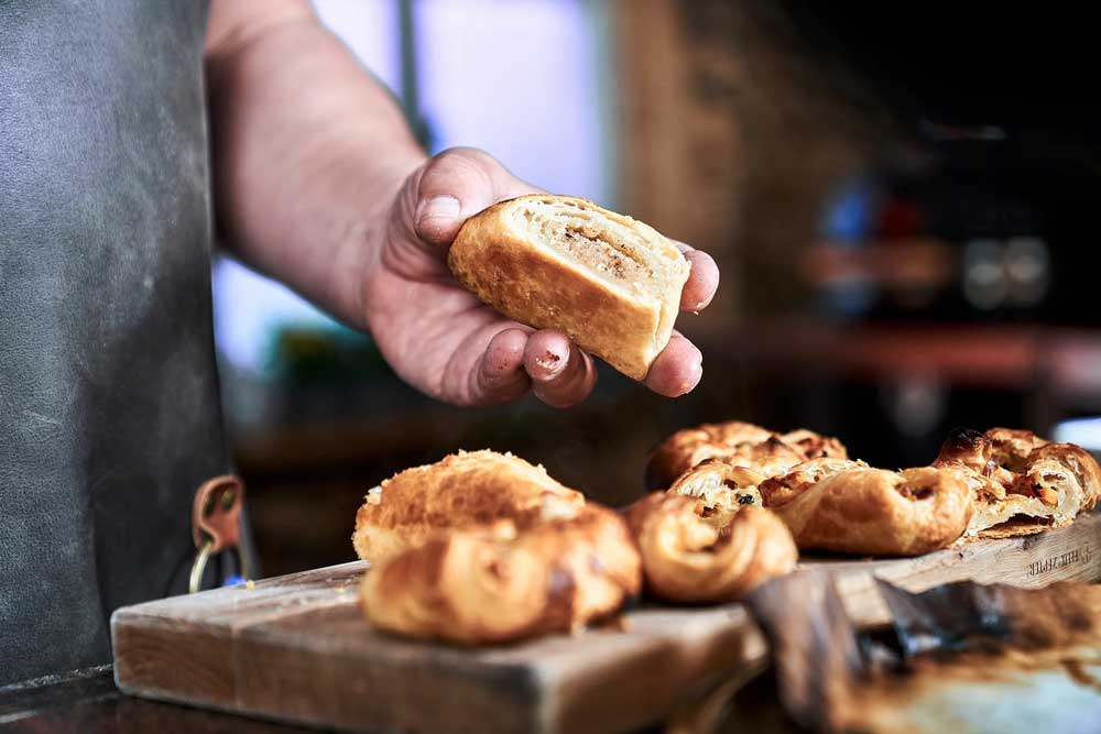 Sein Favorit? Sauerteigbrot! Groß gebacken mit knapp acht Pfund, wodurch sich die Aromen besonders gut entwickeln und die Kruste vielfältig schmeckt. Auch Blätterteig, wie Apfelstrudel, oder lauwarmer Butterkuchen sind beliebt.